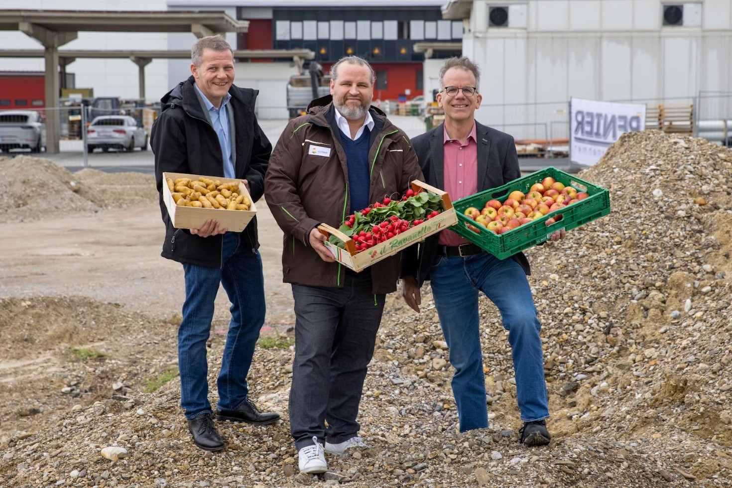Am Bild (v.l.n.r.): Baumeister Ing. Frank Pfnier (Pfnier & Co GmbH), Firmengründer Erich Haller (Obsthaus), Stephan Barasits (Geschäftsführer GMW Großmarkt Wien Betrieb GmbH)