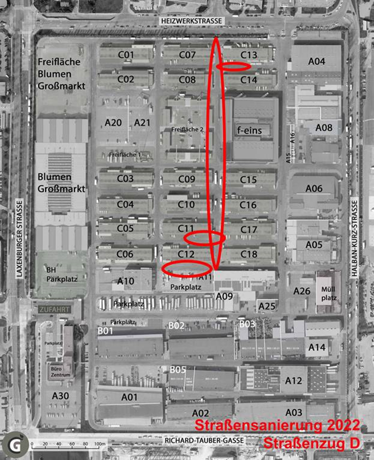 Um den Betrieb am Großmarkt zu berücksichtigen, werden die Sanierungen nicht zu den Hauptbetriebszeiten stattfinden. Außerdem werden die Bauarbeiten abschnittsweise durchgeführt d.h. es kommt zu keiner Komplettsperre.